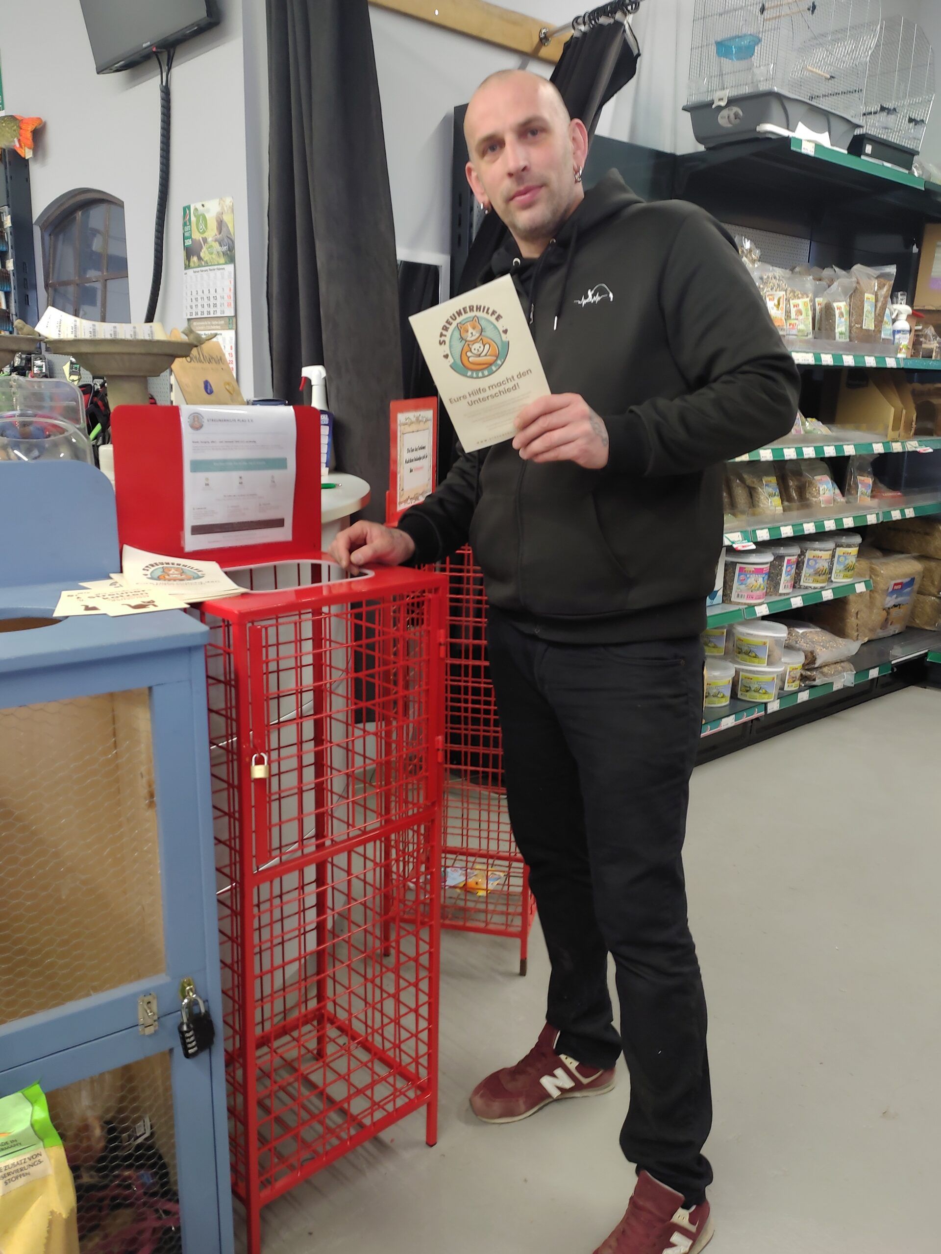 Neben der Futterspendenbox findet ihr dort auch Flyer mit Infos über unsere Arbeit und eine Spendendose.