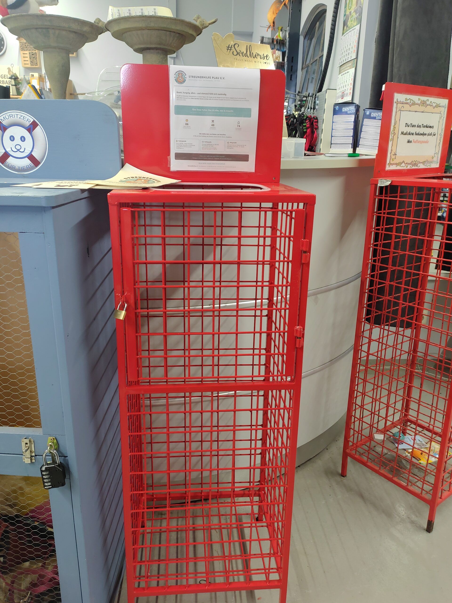 Es ist so weit: Unsere große, rote Futterspendenbox hat ein Zuhause gefunden! Ab sofort steht sie im Kiebitzmarkt in Malchow.