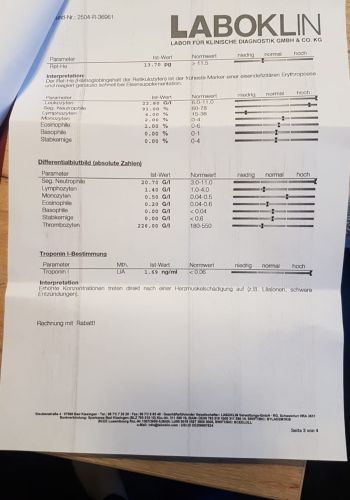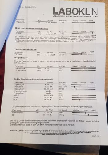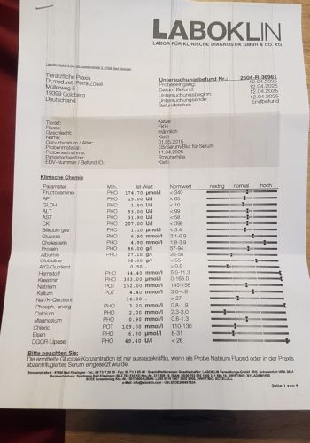 Beim Tierarzt zeigte sich, dass es ernst war: Klette litt an einer schweren, fast irreversiblen Nierenschädigung. Seine Blutwerte waren extrem schlecht – Harnstoff, Phosphat und Kreatinin lagen so hoch, dass sie kaum noch messbar waren. Er roch bereits stark nach Urin – ein deutliches Zeichen, wie schlecht es ihm ging.