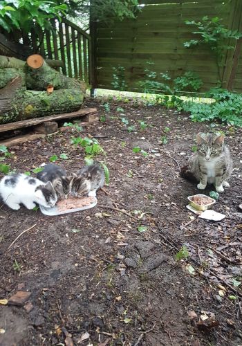 Dann, im Frühling 2023, zeigte sich deutlich: Miezi war trächtig. Bis dahin wussten wir nicht einmal, dass sie ein Weibchen war. Wenige Wochen später gebar sie unter freiem Himmel vier Kitten – versteckt unter einem Holzstapel. Voller Sorge beobachteten wir sie aus der Ferne, ohne sie zu bedrängen. Sie glaubte anfangs, wir wollten ihr die Kleinen wegnehmen – was wir natürlich nie vorhatten.
