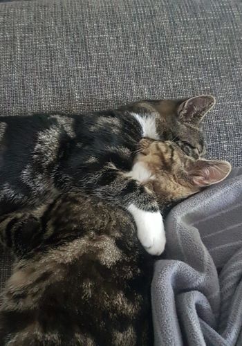 Besonders tief ist seine Bindung zu Mausi geworden – seit Fledermäuschen vermittelt wurde und ihre gemeinsame Schwester auf tragische Weise ums Leben kam. Wenn Purzel nach draußen geht, wird Mausi unruhig und ruft nach ihm. Und als Mausi kastriert wurde, wich Purzel keinen Moment von ihrer Seite. Er putzte sie vorsichtig, hielt Nähe – und wachte über sie wie ein kleiner Bruder mit großem Herzen.
